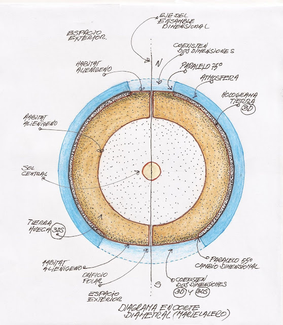 Este nivel dimensional más sutil de la 3D que se desarrolla en la superficie polar indicada del planeta  se comunica y continúa por un orificio situado en los polos, con una  esfera hologramica 3DS    ensamblada en el holograma Tierra y más pequeña que esta.